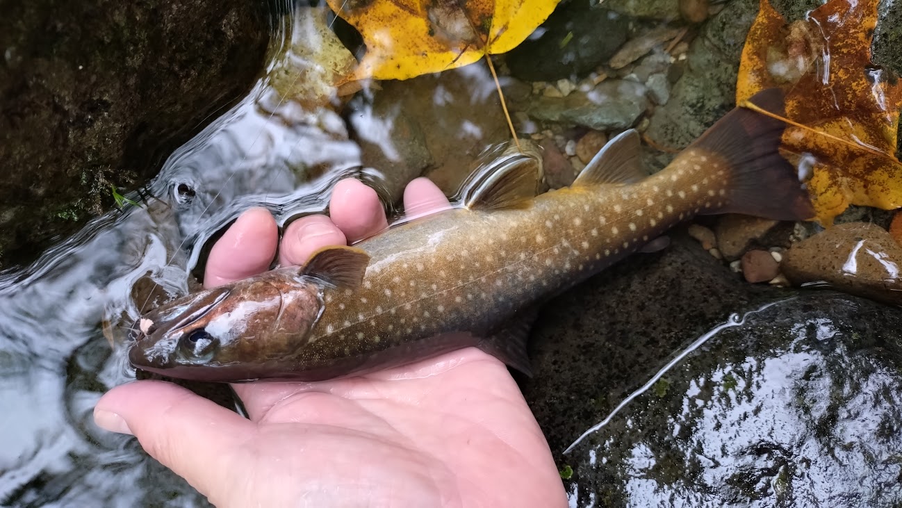 支度し釣り開始。川を見るとイワナが肩口で定位しています。